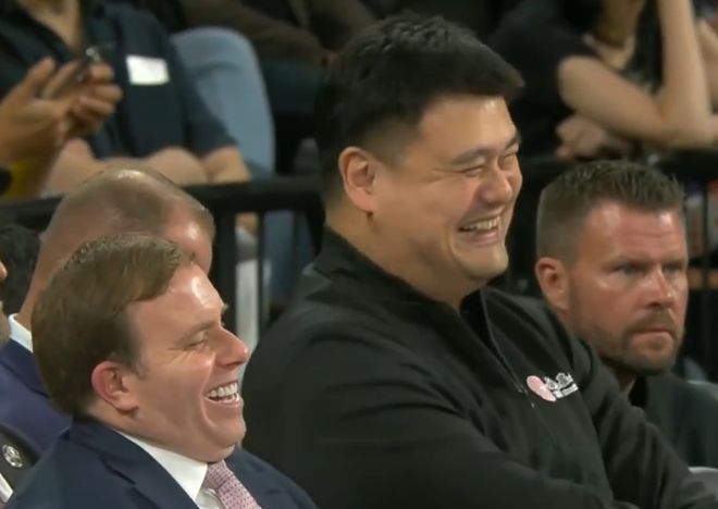 姚明观战场下乐开花。